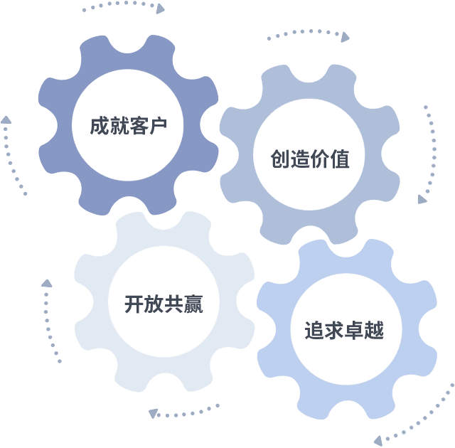 成就客户是一切决策的出发点,,,,创造价值是衡量所有工作的标准,,,追求卓越是我们做事做人的态度,,开放共赢是我们的格局也是最终的结果。。价值观的齿轮环环相扣,,,,推动着组织里的每个人不断向前。。。。