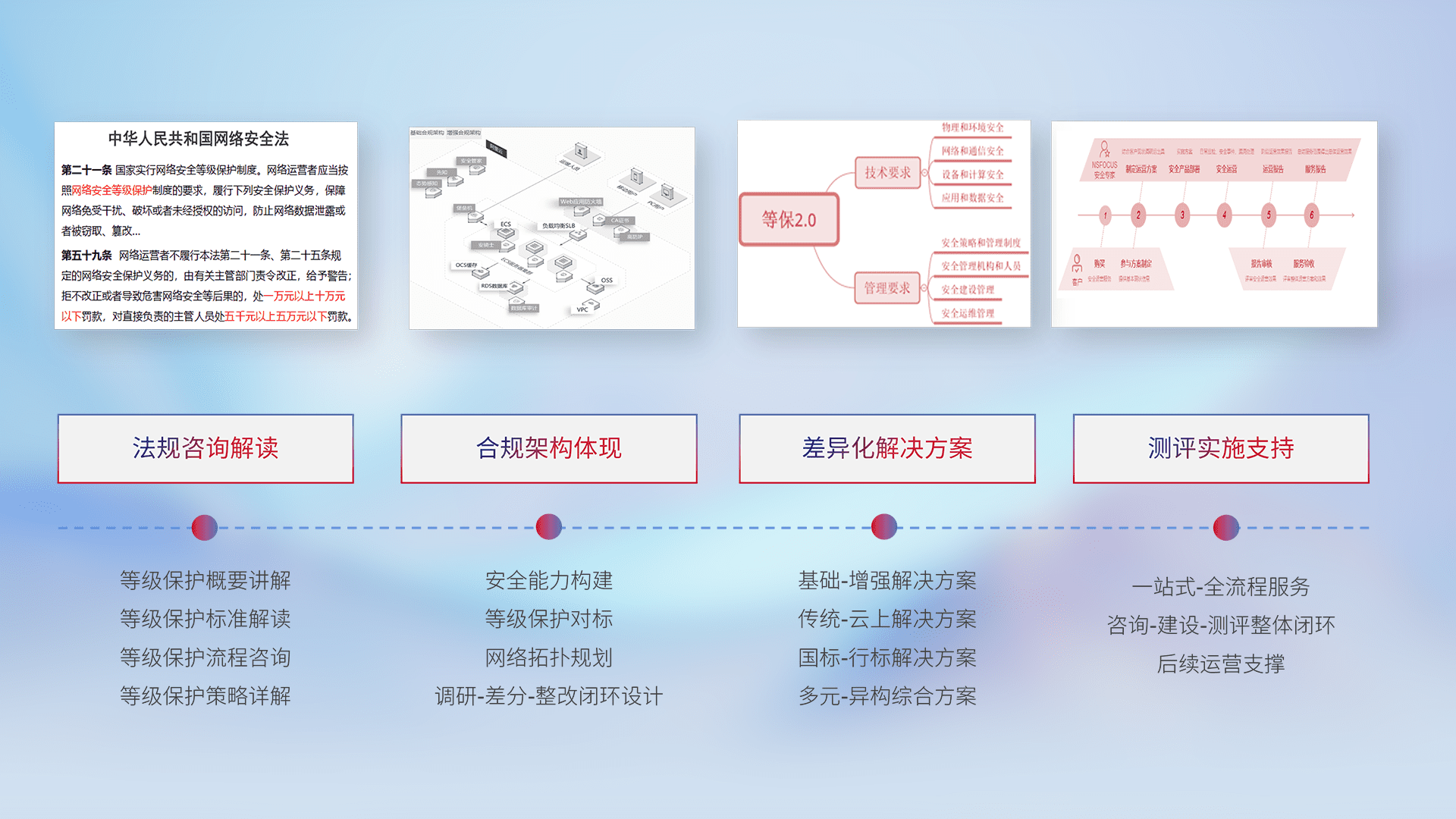 通过专业的法律咨询解读、、、、合规架构体现、、差异化解决方案、、、测试实施支持等服务,,为客户量身打造等保合规体系。。